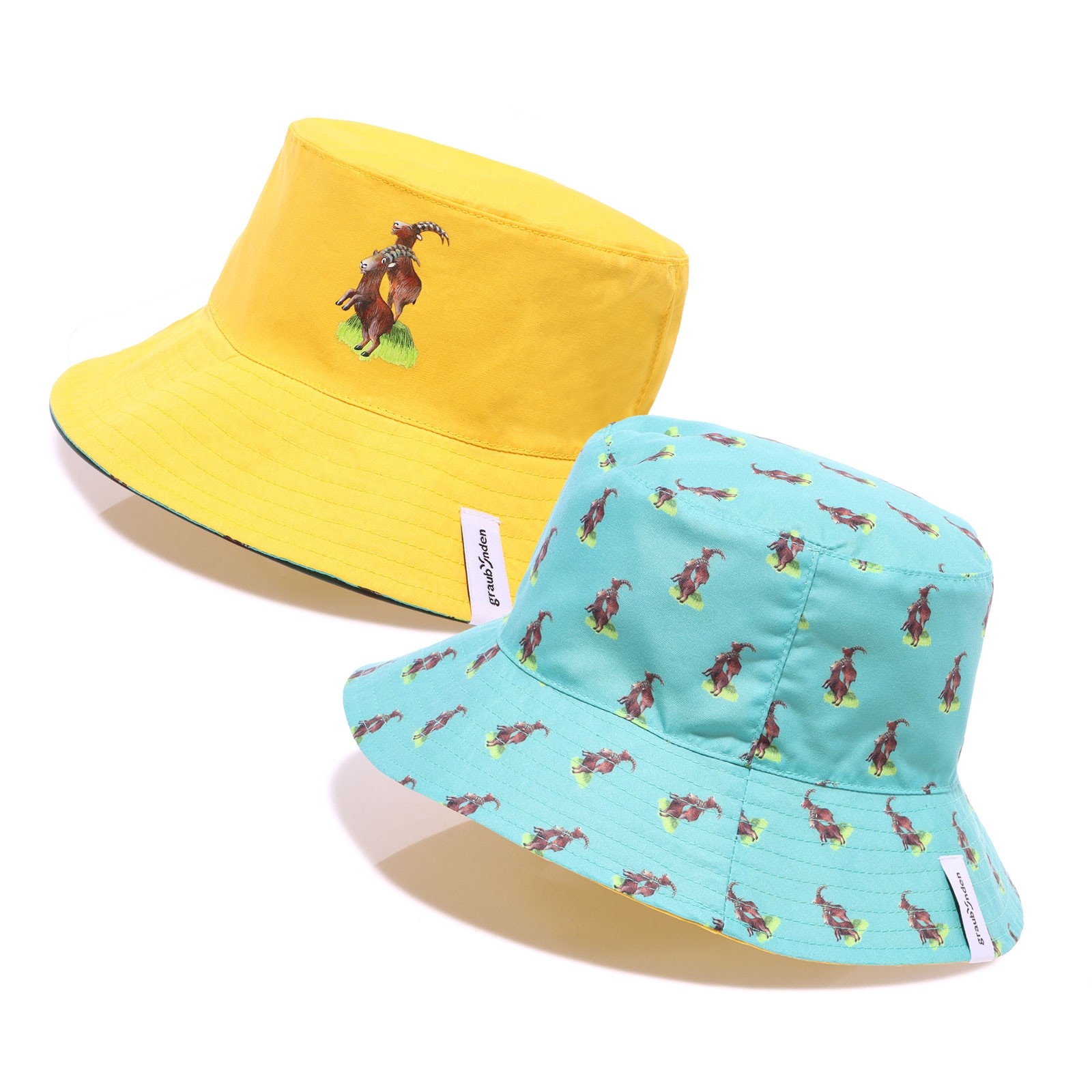 Der süsse Kinder Sonnenhut mit den beiden Steinböcken Gian & Giachen in fröhlichen Farben ist perfekt für sonnige Tage.